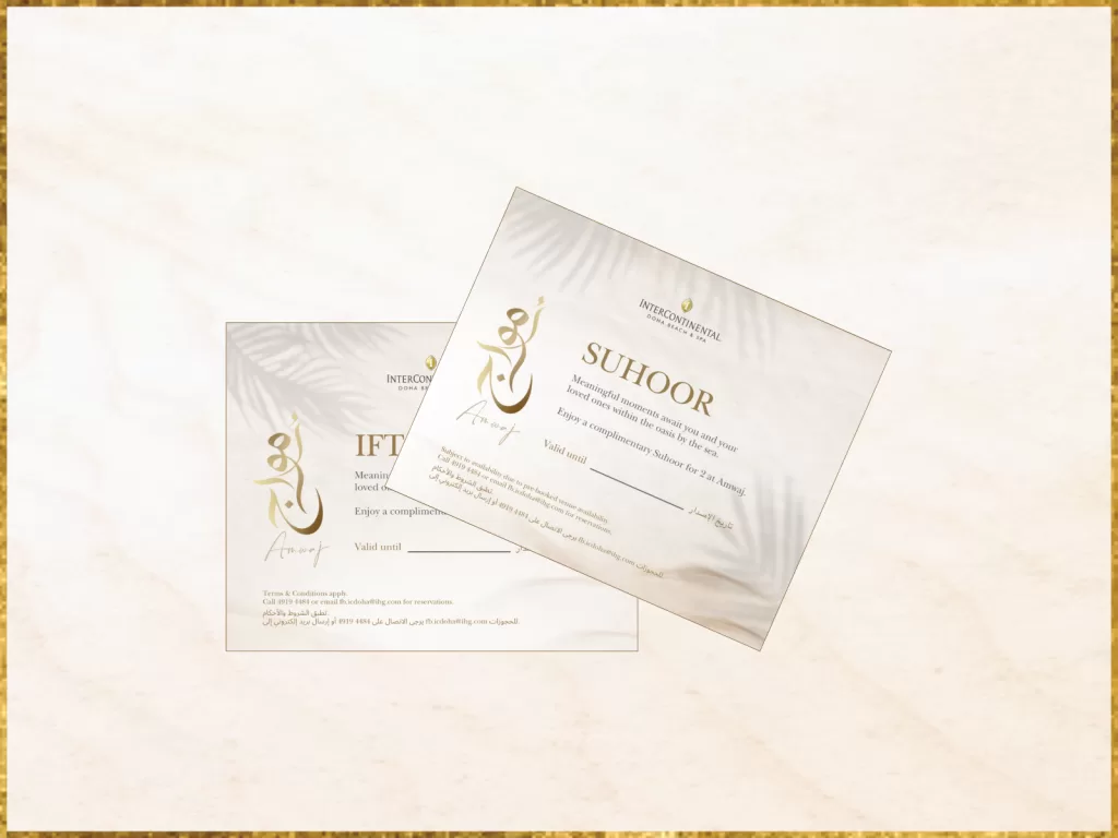 Celebrate the season of giving with Ramadan Gift Vouchers from InterContinental Doha Beach & Spa. From Iftar and Suhoor at Amwaj to luxury stays and dining across our award-winning restaurants, each voucher is a refined way to share meaningful moments during the holy month.