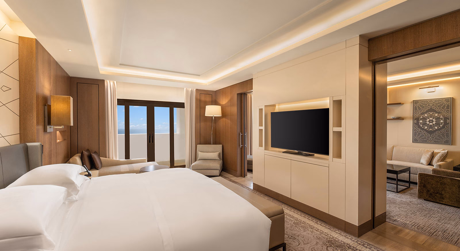 Enjoy added space and elegance in our refined suites, complete with generous living areas and sweeping Gulf or city views. Ideal for business or leisure, our suites offer an elevated experience at one of Qatar’s leading beachfront hotels.Â